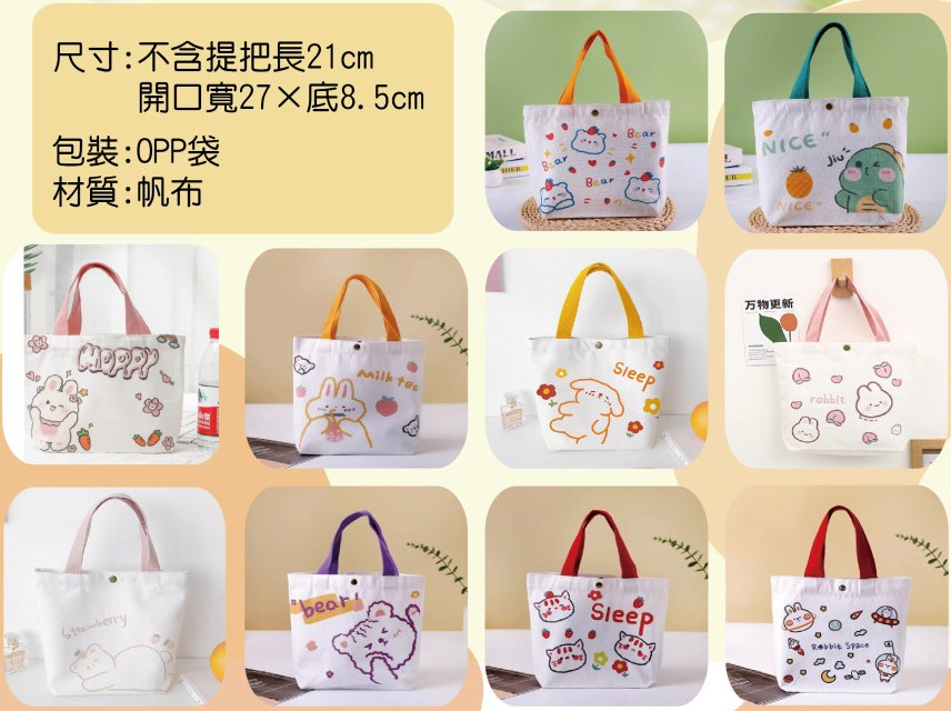 销售方式:制造、批发销售目标市场:台湾、香港、新加坡询价付款方式:T.T. 电汇竞争特点接受独特设计或logo:可接受特别设计或LOGO适用于促销品或礼赠品多样设计:添右企业有限公司提供卡通帆布手提袋的多样化设计